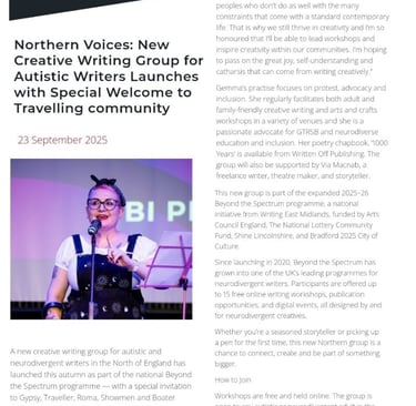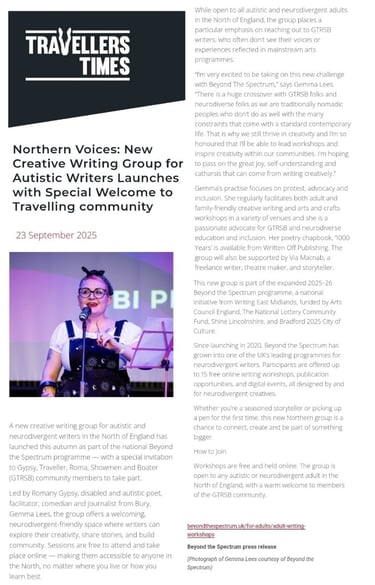We offer a special welcome to members of the GRTSB (Gypsy, Roma, Traveller, Showmen and Boater) communities because these voices are often marginalised — not only in wider society, but also within neurodivergent and creative spaces. GRTSB people who are also autistic may face multiple layers of misunderstanding, exclusion, and stigma, making it harder to access support, representation, or a sense of belonging. By creating a space led by a Romany Gypsy writer, we hope to build trust, visibility, and community — ensuring that GRTSB perspectives are recognised, respected, and celebrated within our shared creative space.