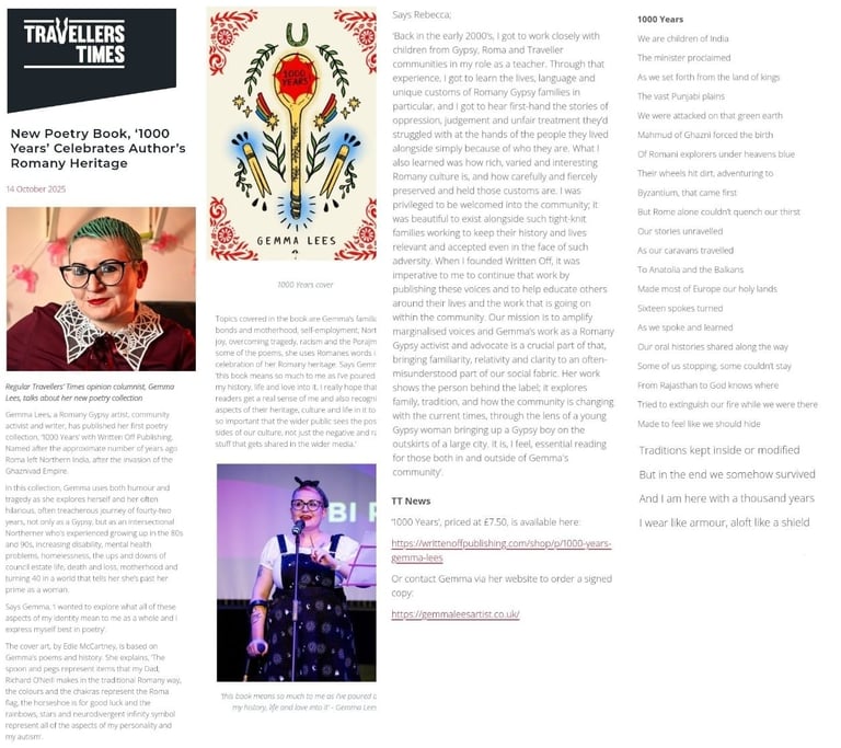In this collection of poetry, artist and educator Gemma Lees uses both humour and tragedy as she explores herself and her often hilarious, often treacherous journey of forty years not only as a Gypsy, but as an intersectional Northerner. Drawing on experiences growing up in the 80s and 90s including increasing disability, mental health problems, homelessness, the ups and downs of Council Estate life, death and loss, motherhood and turning 40 in a world that tells her she’s past her prime as a woman, 1000 Years and the poems within explore what all of these aspects of her identity mean to her as a whole.