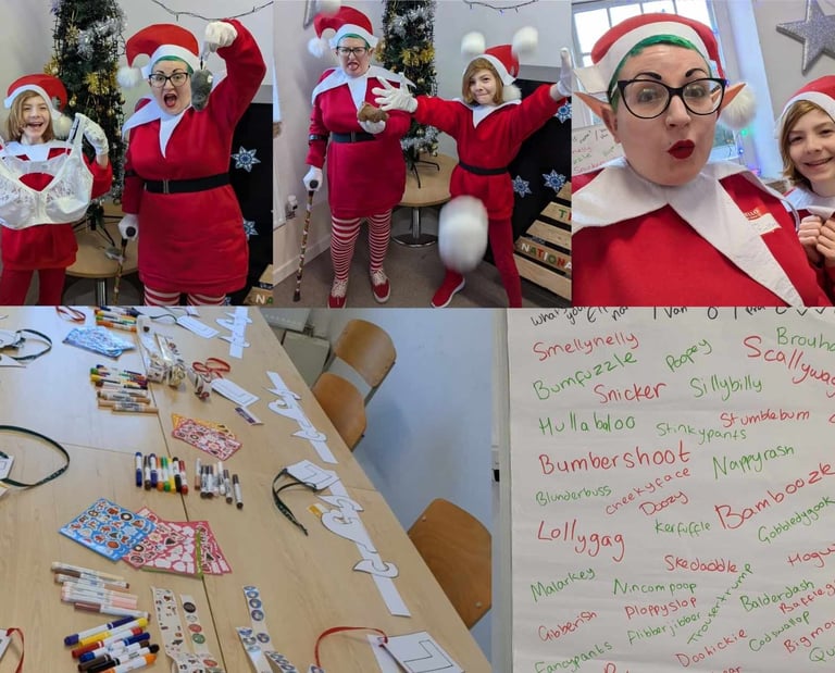 This fun kid-friendly workshop, devised and ran by me with my trusty sidekick elf, Tommy, can be brought to any space, festival, party or event. Participants will choose an elf name, make an elf hat and an 'elf-plate' before pulling funny and harmless pranks on their parents and any other willing adults, such as pelting them with indoor snowballs, (pompoms), putting a big bra on a statue, letting loose a wind-up mouse, surprising someone with a rubber spider, planting a reindeer poop, (slime), and more! The session ends with the naughty elf oath and the presentation of a certificate and mini joke kit to take home.