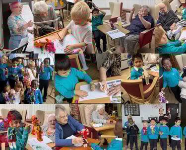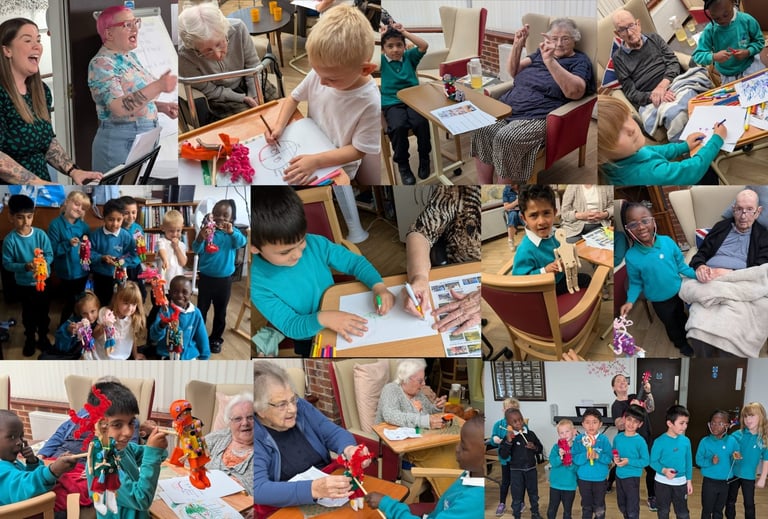I was project manager and lead artist for this 8-month intergenerational project in 2025, with Coleridge Primary School, Eastwood House Care Home and Rotherham Museums. Over twelve sessions, working with Year 1 pupils and older adults with dementia, (the largest age gap being 95 years), I coordinated other artists and devised and ran sessions in painting and making clothes for traditional wooden jog dolls and in co-creating a banner. I also facilitated the writing of a collective poem and co-facilitated the writing of two songs, one with instruments and one with actions, all of which were presented at a showcase for parents, carers and family members, complete with a prize giving with certificates and goodie bags for the participants. I created a session-by-session scrap book with images and activities completed to help participants recall each session.